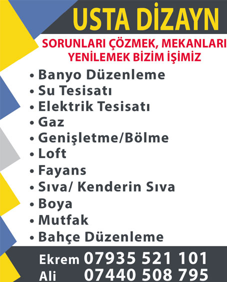 •Elektrik •Çatı İşleri •Painting •Laminant Flooring •Kitchen Fitting •Door Fitting •Gaz •Sıva ve her türlü tamir/tadilat işleri yapılır.