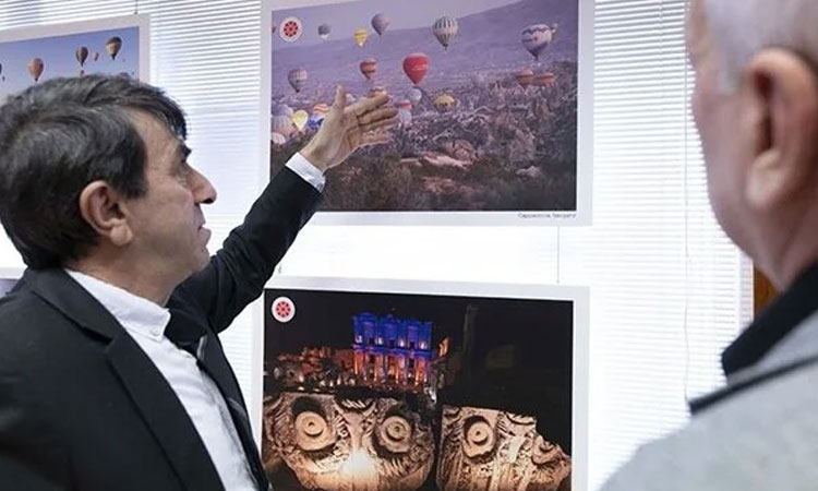 Ege sahilleri, antik kentler, tarihi yapılar ve manzaraların yer aldığı 40 kareden oluşan sergiyi gezen Ertaş, fotoğraflarla ilgili bilgi aldı.