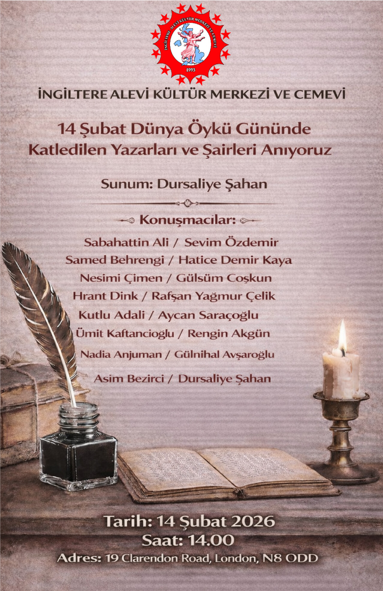 İngiltere Alevi Kültür Merkezi ve Cemevi’nde düzenlenecek etkinlik, Sabahattin Ali ile başlayacak daha sonra Samed Behrengi, Nesimi Çimen, Hrant Dink, Kutlu Adalı, Ümit Kaftancıoğlu, Nadia Anjuman ve Asım Bezirci’yle devam edecek.