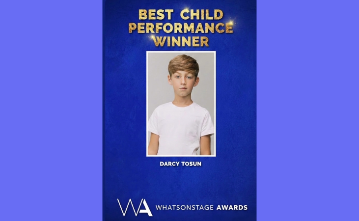 İngiltere’de yaşayan Türk çocuk oyuncu Darcyn Tosun, tiyatro dünyasının önemli organizasyonlarından biri olan WhatsOnStage ve GoLive Theatre tarafından düzenlenen ödüllerde “En İyi Çocuk Oyuncu” ödülüne layık görüldü.